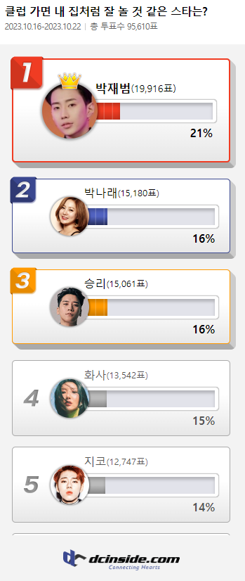 커뮤니티 포털사이트 디시인사이드(대표 김유식)가 `클럽가면 내 집처럼 잘 놀 것 같은 스타는?`으로 투표를 한 결과 박재범이 1위에 올랐다. 이 투표는 지난 16일부터 22일까지 총 7일간 진행했다.