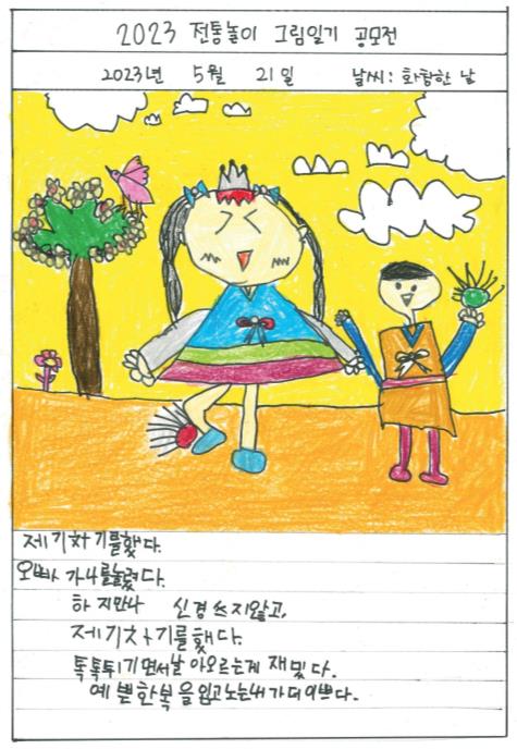 공진원의 ‘전통놀이문화 조성 및 확산사업’의 일환으로 개최돼 올해 4회를 맞은 《2023 전통놀이 그림일기 공모전》은 전통놀이 체험후기를 주제로 하여 전통놀이를 즐길 기회가 적은 아이들에게 다양한 전통놀이를 체험해보는 계기가 되고 있다.