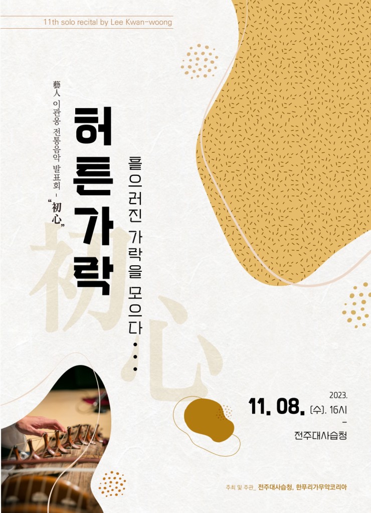 [플레이뉴스 문성식기자] 아쟁 명인 이관웅이 오는 11월 8일 (수) 오후 4시 전북 전주 전주대사습청에서 전통음악 발표회 ‘초심(初心)’을 연다.