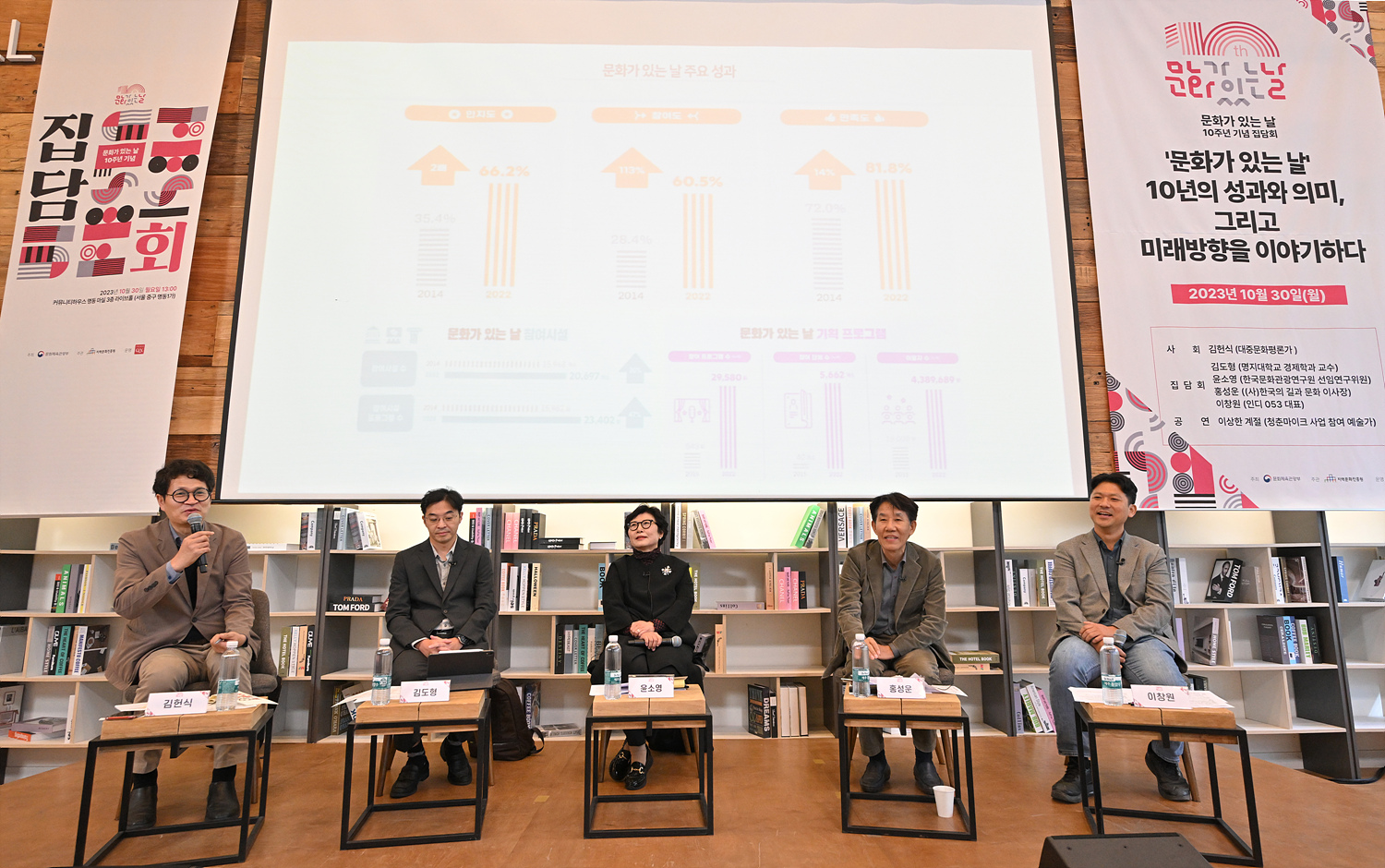 1030일에는 서울 커뮤니티하우스 마실에서 문화가 있는 날 10주년 기념 집담회가 열렸다. 집담회는 문화분야 전문가, 문화가 있는 날 사업에 참여했던 문화예술기관단체 담당자, 문화기획자 등 60여 명이 참여하여 문화가 있는 날’ 10년의 성과와 의미, 그리고 미래방향에 대한 이야기를 나누었다.