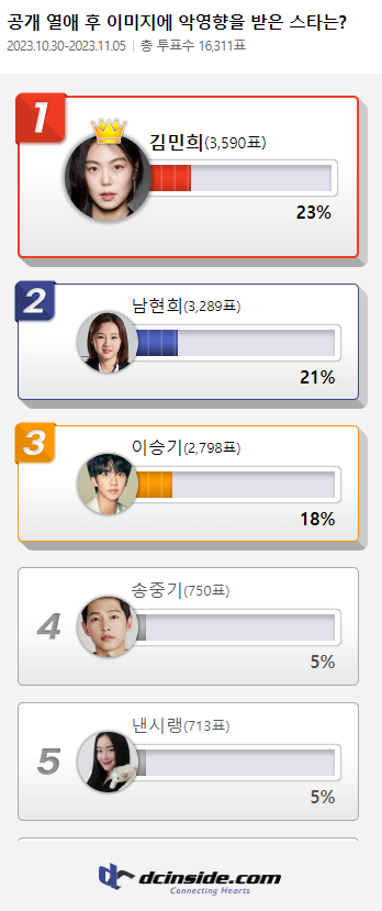 커뮤니티 포털사이트 디시인사이드(대표 김유식)가 `공개 열애 후 이미지에 악영향을 받은 스타는?`으로 투표를 한 결과 김민희가 1위에 올랐다. 이 투표는 10월 30일부터 11월 5일까지 총 7일간 진행했다.