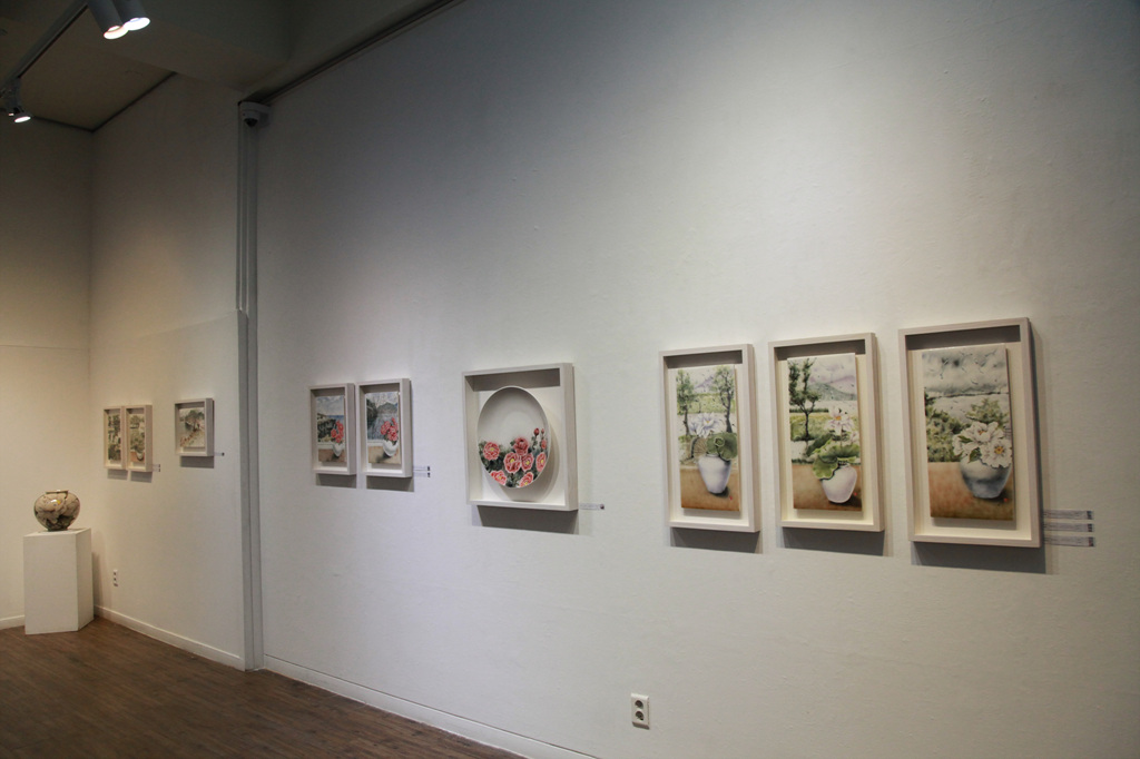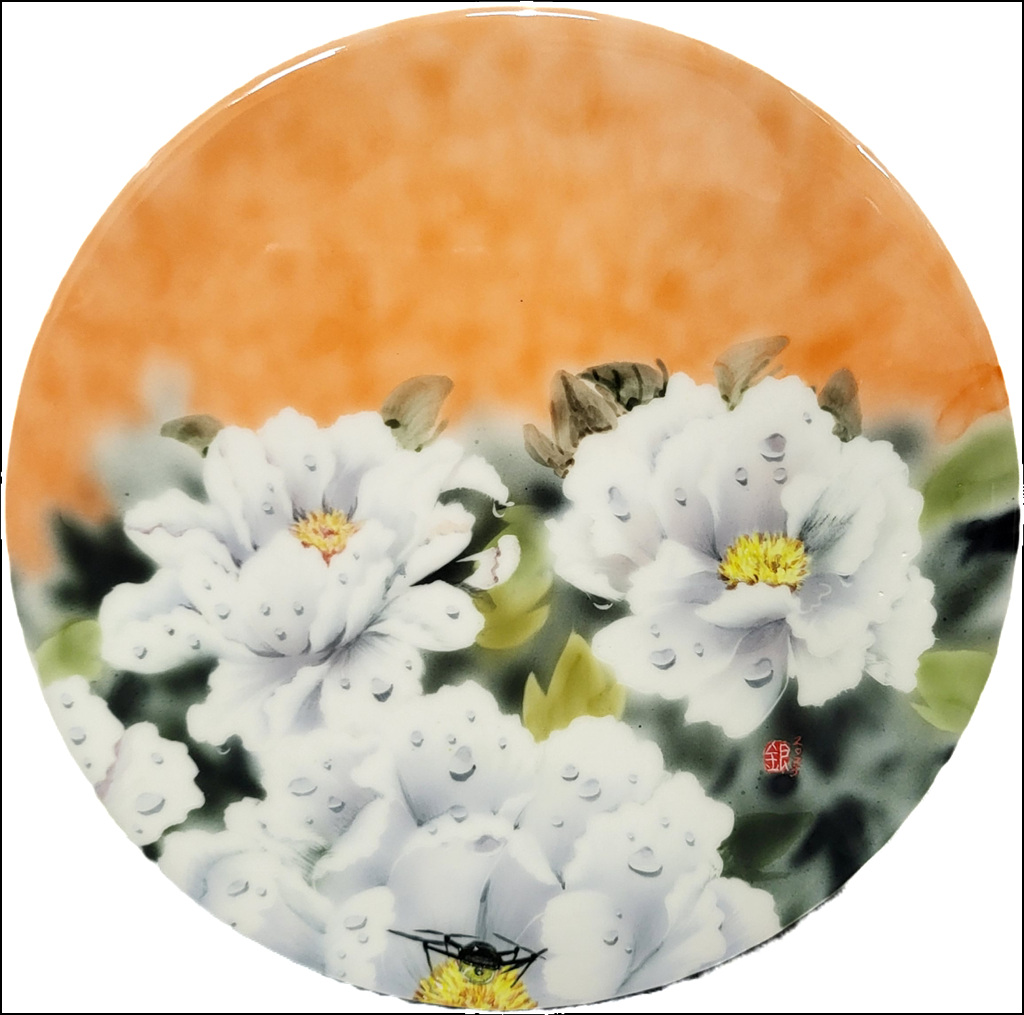 도자회화 김은경 작가는 모란과 연꽃이 가진 자연스러운 빛과 형태를 백자도판에 도자 안료로 그리고 유약을 바른 후 1230°C 이상의 고온에서 10시간이 넘는 소성의 시간을 거쳐 완성하는 과정을 즐기고 최대한 실물에 가깝게 구현해 냈다.