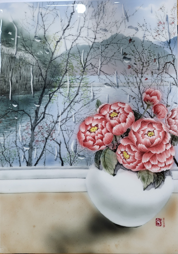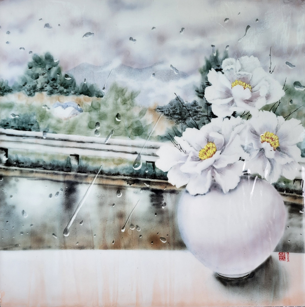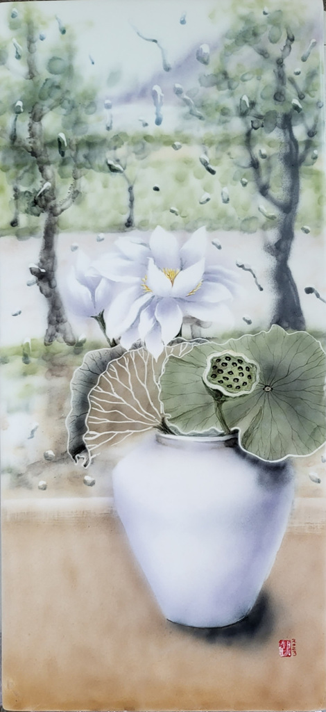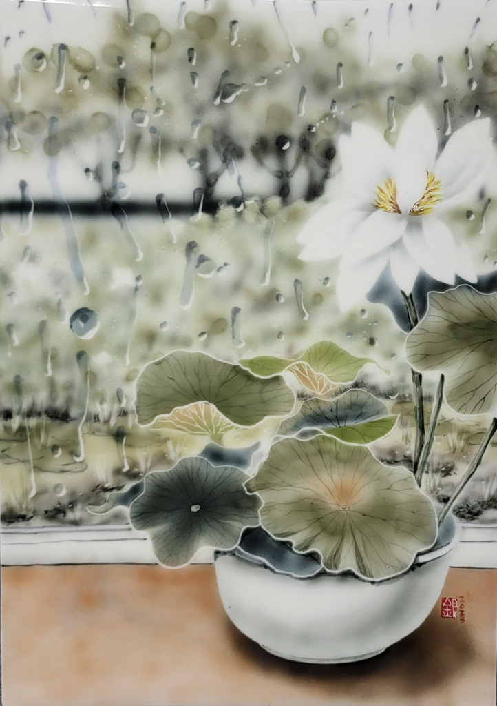 반짝이는 백자도판 위의 꽃들은 창가의 흐르는 빗물 배경에 맑고 깨끗한 아름다움이 극대화 되어 바라보는 시선이 편안하고 안정적이다. 작품명 '창가와 연꽃'은 진흙에서도 곧게 자라 고운 자태를 뽐내고 그 주변까지도 중화시키는 아름다운 연꽃으로 만들었다.