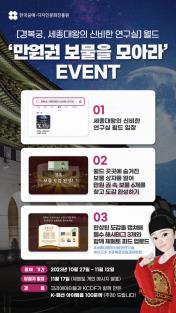 행사 ‘만원권 보물을 모아라’는 경복궁 공간 곳곳에 숨겨진 보물 상자를 찾아 만원권 속 6개의 보물을 발견, 도감을 완성하는 내용이다. 완성된 도감을 이미지로 저장해 지정 ‘#’단어(해시태그)와 함께 제페토에 게시하면 가상공간에서 사용할 수 있는 예쁜 의상을 선물 받을 수 있다.