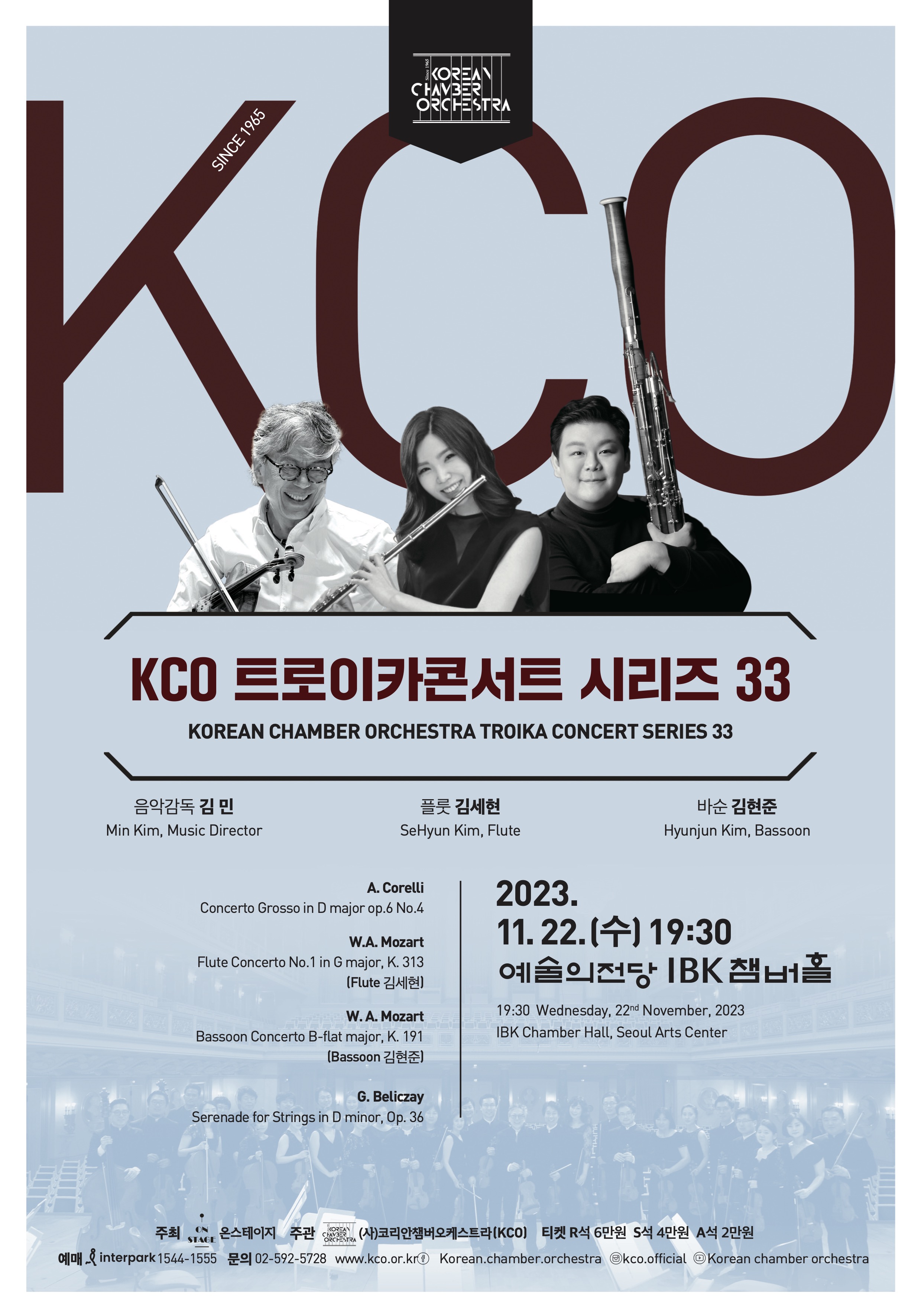 [플레이뉴스 문성식기자] 오는 11월 22일 수요일 오후 7시30분, 예술의전당 IBK챔버홀에서 진행될 코리안챔버오케스트라의 서른 세번째 트로이카 콘서트 시리즈로 청중에게 특별한 클래식 음악의 밤을 선사할 예정이다. 이날 공연은 한국을 대표하는 챔버오케스트라인 코리안챔버오케스트라는 플루티스트 김세현, 바수니스트 김현준이 협연자로 무대에 선다.