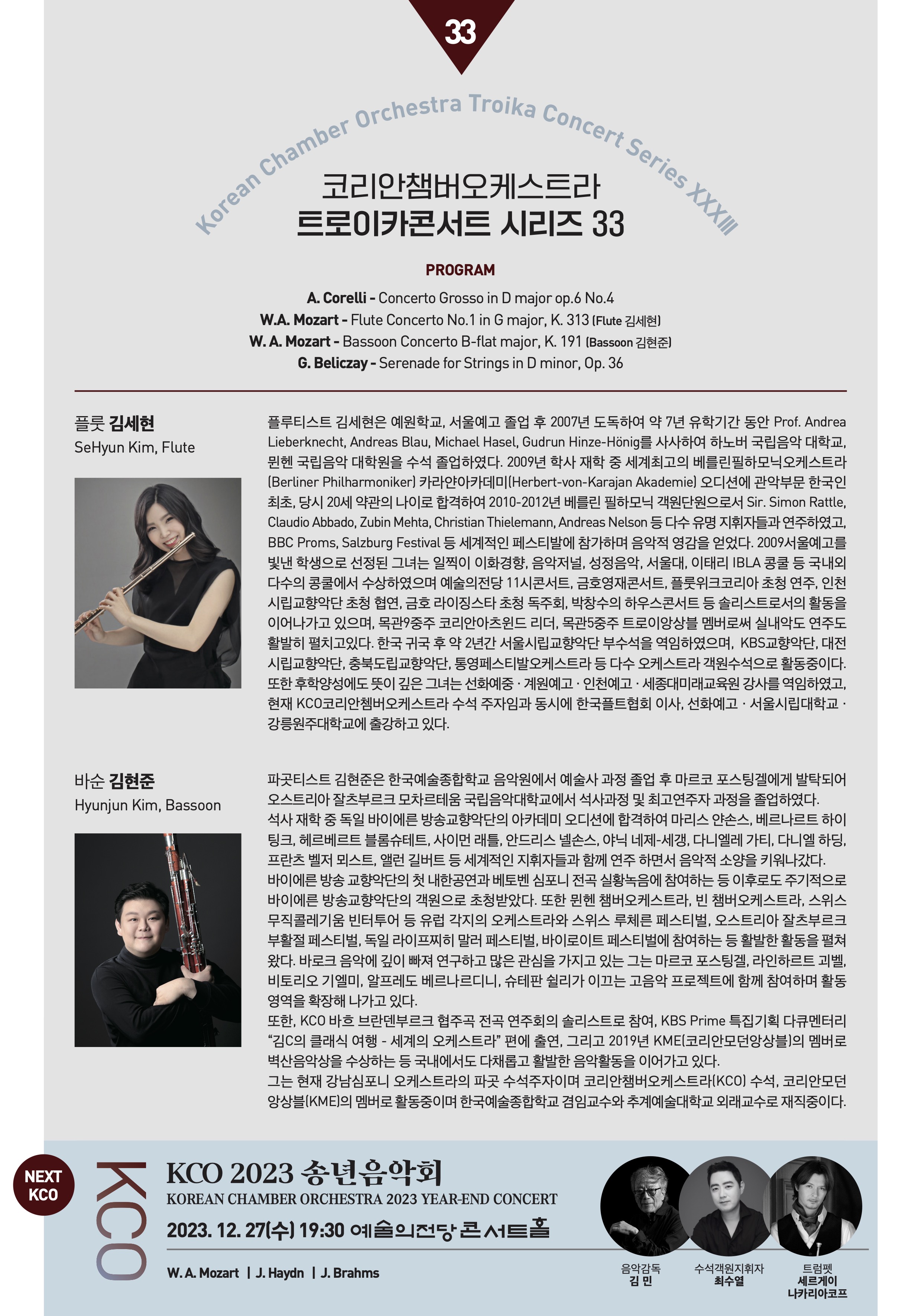 이어 현재 강남심포니 오케스트라의 파곳 수석주자이며 코리안챔버오케스트라(KCO) 수석, 코리안모던앙상블(KME)의 멤버로 활동중이며 한국예술종합학교 겸임교수와 추계예술대학교 외래교수로 재직하며 왕성하게 활동중인 바수니스트트 김현준이 모차르트의 유일한 바순 협주곡이며 바순 특유의 유머로 가득차 있는 바순 협주곡을 '모차르트 전문 연주 단체'로 관객들에게 칭찬받는 KCO가 연주할 예정이다.
