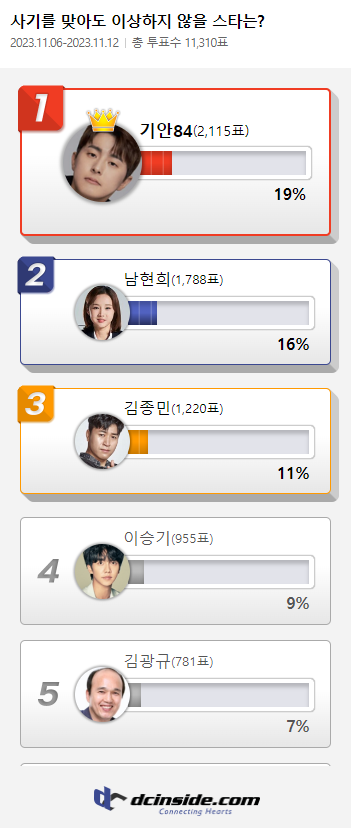 커뮤니티 포털사이트 디시인사이드(대표 김유식)가 `사기를 맞아도 이상하지 않을 스타는?`으로 투표를 한 결과 기안84가 1위에 올랐다. 이 투표는 지난 6일부터 12일까지 총 7일간 진행했다.