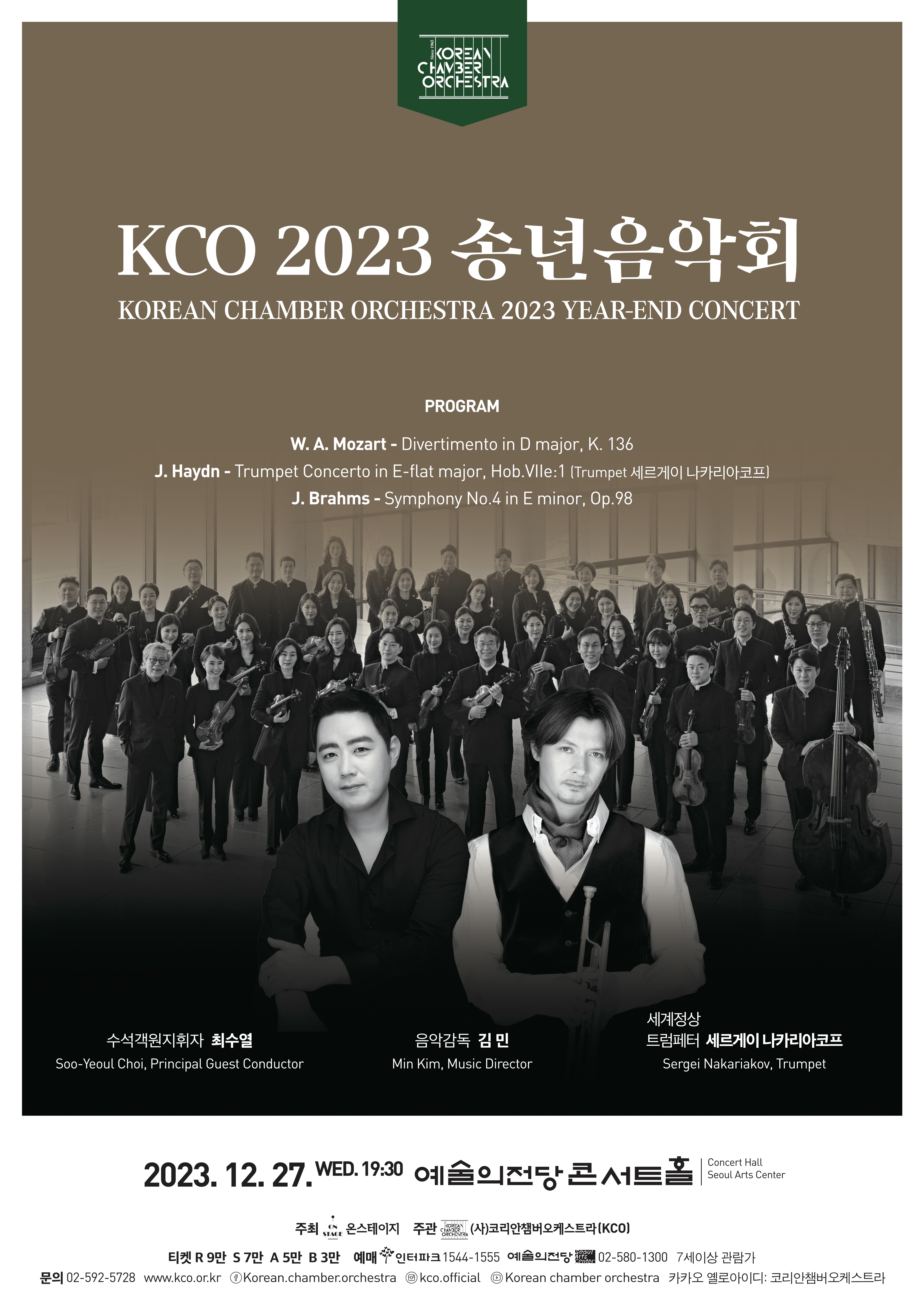 '2023 KCO 송년음악회'를 여는 첫 곡은 지난 2월 모차르트 교향곡 전곡 연주를 한국 최로로 완주하며 '모차르트'하면 떠오르는 단체가 된 KCO가 모차르트의 디베르티멘토로 문을 연다. 4년이라는 긴 시간 동안 모차르트 교향곡 전곡을 완주할 수 있도록 관심과 격려를 아끼지 않은 청중들에게 KCO가 선사하는 한해의 마지막 감사의 의미가 담아 본 작품을 시작으로 연주할 예정이다.