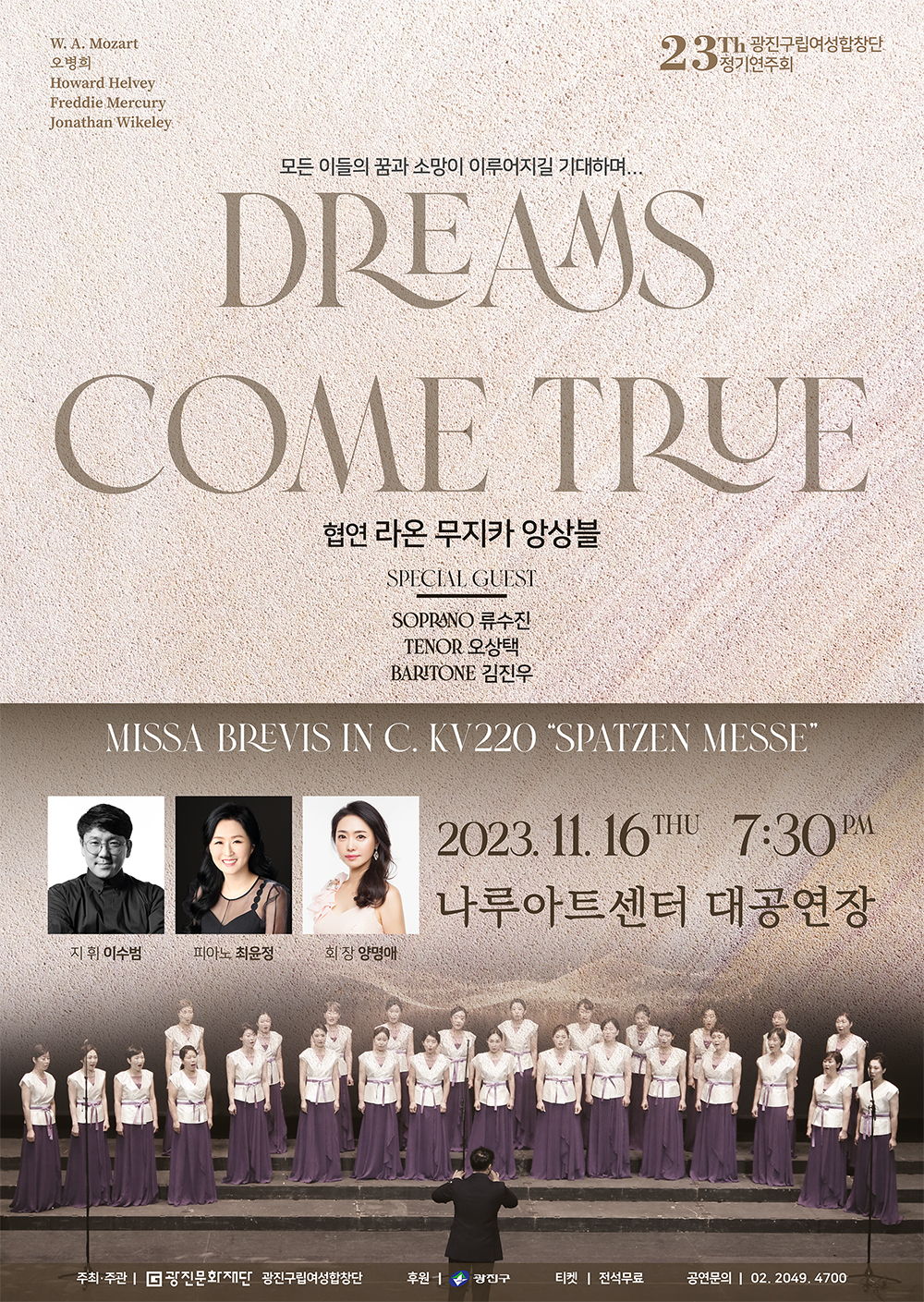 'Dreams Come True'를 주제로 진행되는 이번 정기연주회는 이수범 지휘자의 지휘 아래 광진구립여성합창단이 희망의 하모니를 선보일 예정이며 미사곡, 한국 가곡, 뮤지컬 메들리 등 다양한 합창 무대가 펼쳐진다.