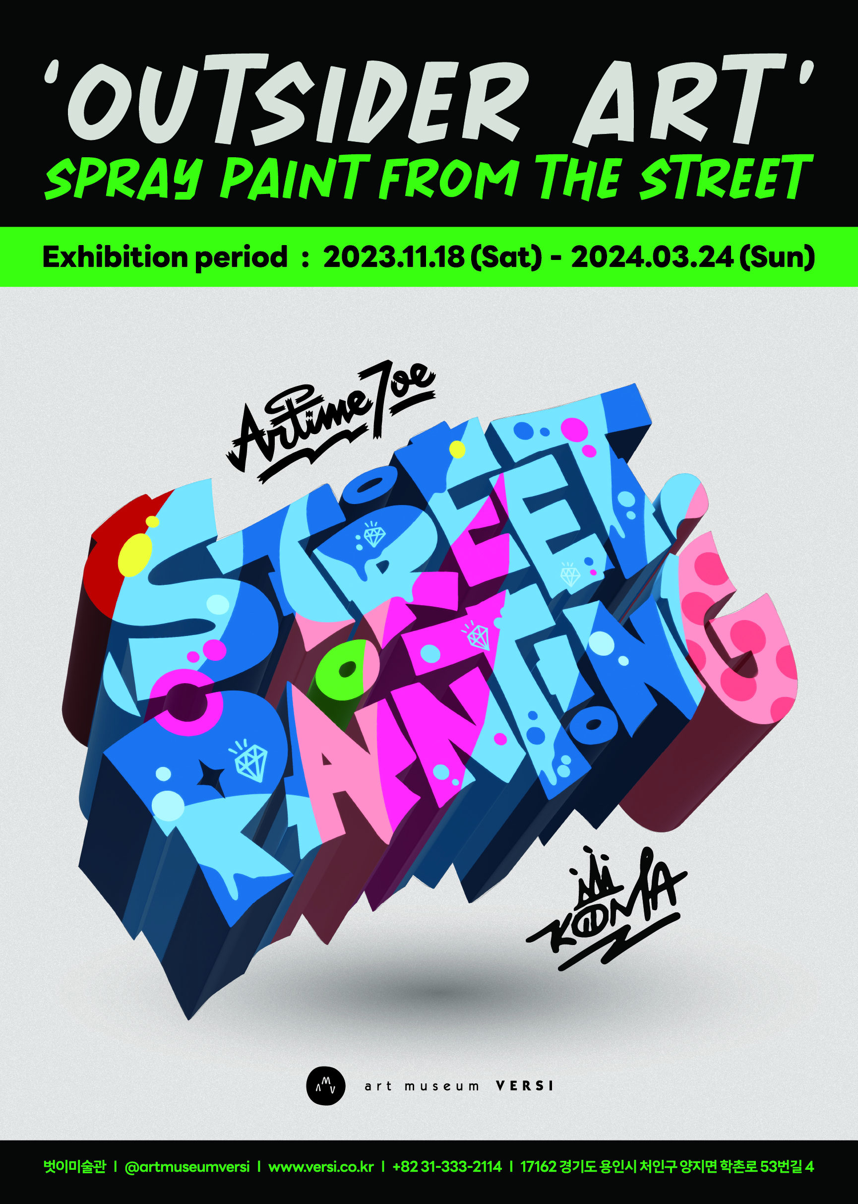이번 전시에서는 아웃사이더 아트(outsider art)의 한 장르인 그래피티(graffiti)를 소개하며, 대한민국 1세대 그래피티 아티스트인 코마(KOMA)와 알타임 죠(Artime Joe)의 작업을 통해 그래피티를 그들만의 형태와 메시지로 관람객들과 소통하고자 한다.