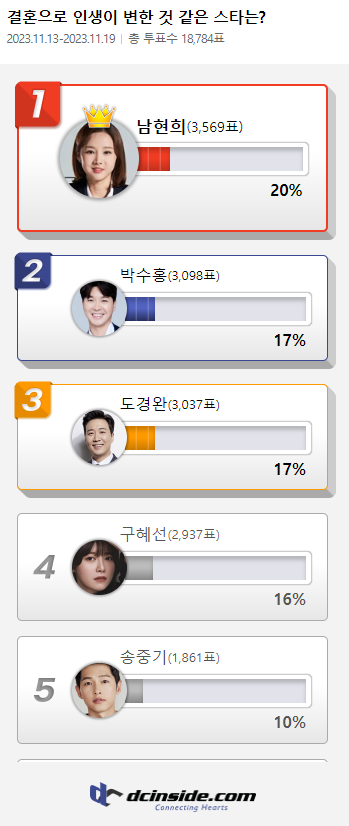 커뮤니티 포털사이트 디시인사이드(대표 김유식)가 `결혼으로 인생이 변한 것 같은 스타는?`으로 투표를 한 결과 남현희가 1위에 올랐다. 이 투표는 지난 13일부터 19일까지 총 7일간 진행했다.