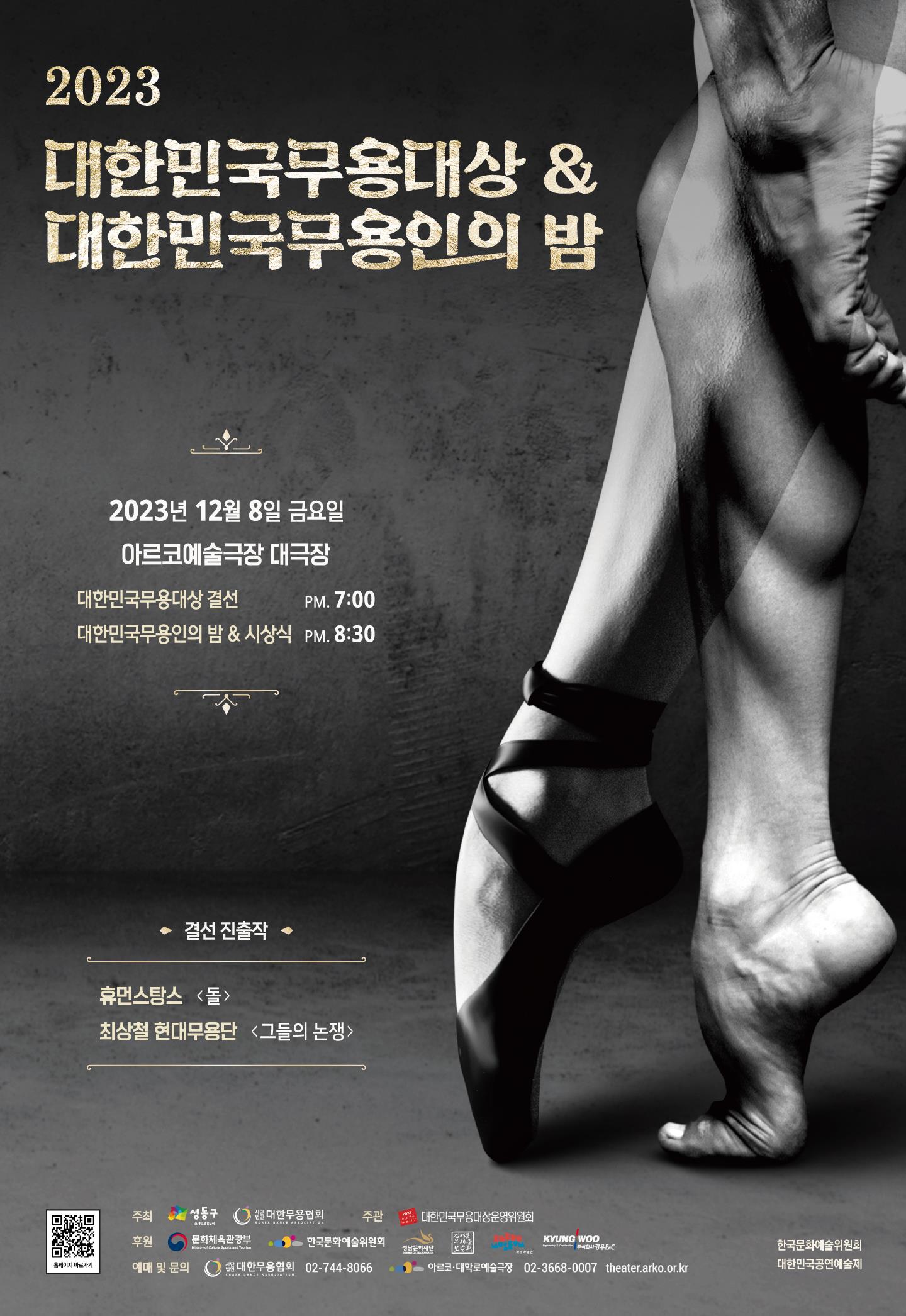 (사)대한무용협회가 주최하고, 대한민국무용대상 운영위원회가 주관하는 「2023 대한민국무용대상」 결선이 아르코예술극장 대극장에서 12월 8일 금요일 오후 7시에 진행한다. 본선을 통해 선정된 상위 두 단체는 최상철 현대무용단의 '그들의 논쟁'과 휴먼스탕스의 '돌'이다.
