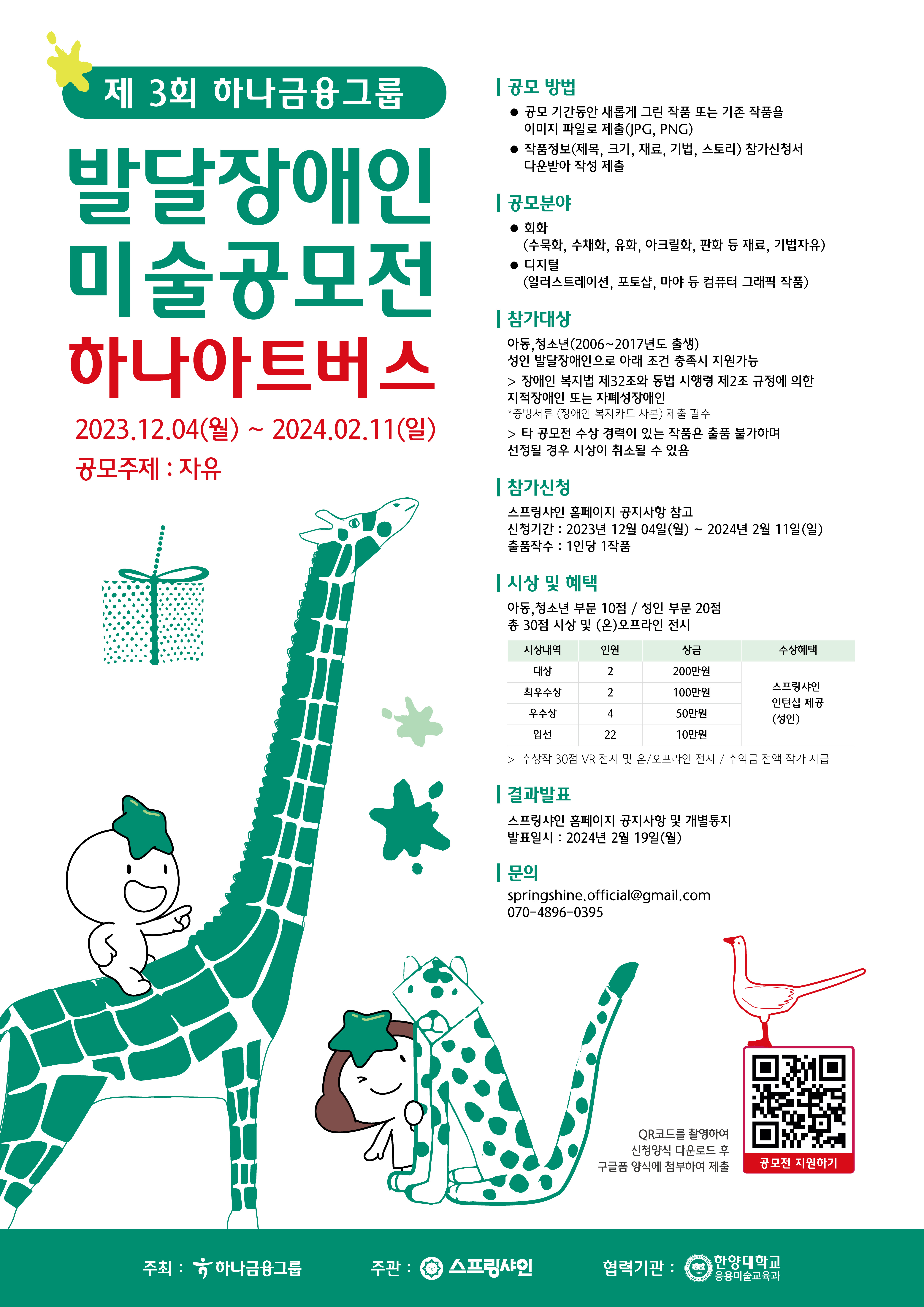 제3회 하나 아트버스의 접수 기간은 2023년 12월 4일(월)~2024년 2월 11일(일)이며, 스프링샤인 홈페이지(https://springshine.co.kr/)를 통해 접수할 수 있다.