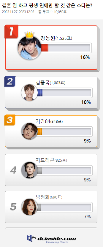 커뮤니티 포털사이트 디시인사이드(대표 김유식)가 `결혼 안 하고 평생 연애만 할 것 같은 스타는?`으로 투표를 한 결과 강동원이 1위에 올랐다. 이 투표는 11월 27일부터 12월 3일까지 총 7일간 진행했다.