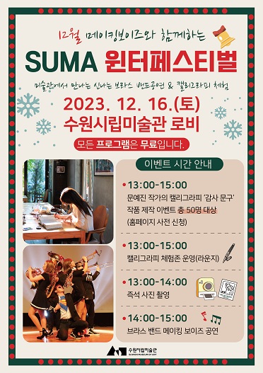 - 12. 16.(토) 오후 1시-3시까지 수원시립미술관 로비에서 무료로 개최 '2023 SUMA 윈터 페스티벌' 개최