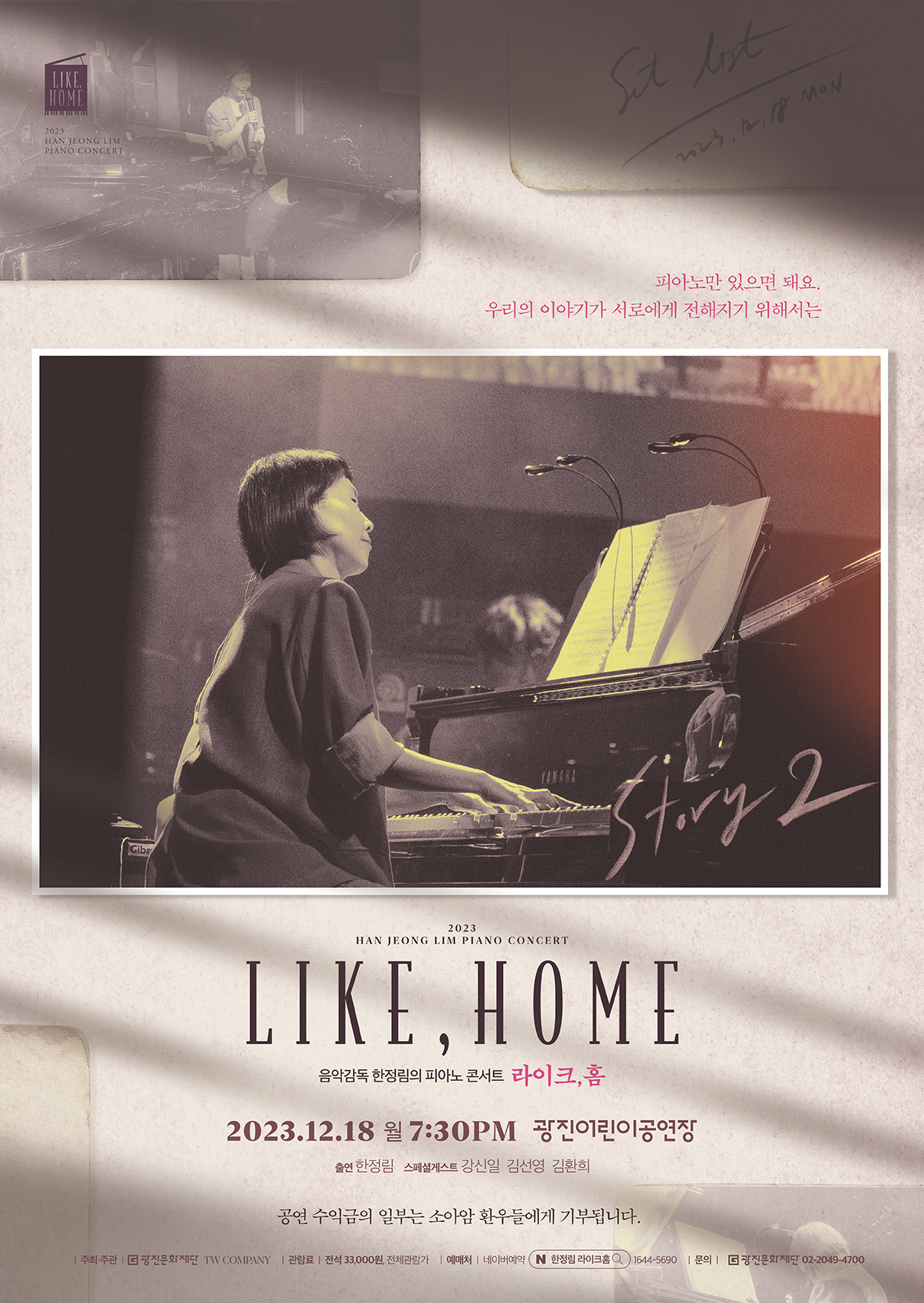 한정림의 피아노 콘서트 'Like, Home'은 음악을 통해 집과 같은 편안함을 느낄 수는 작은 공연으로 작곡가 겸 피아니스트 한정림이 피아노 선율로 자신의 인생 이야기를 관객에게 선보인다.