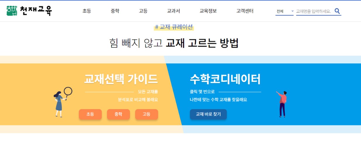 천재교육의 교재 큐레이션 서비스는 학생들이 자신에게 맞는 교재를 선택할 수 있도록 지원하는 서비스로, ‘교재 선택 가이드’와 ‘수학 코디네이터’로 구성돼 있다.