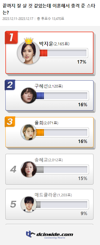 커뮤니티 포털사이트 디시인사이드(대표 김유식)가 `끝까지 잘 살 것 같았는데 이혼해서 충격 준 스타는?`으로 투표를 한 결과 박지윤이 1위에 올랐다. 이 투표는 지난 11일부터 17일까지 총 7일간 진행했다.