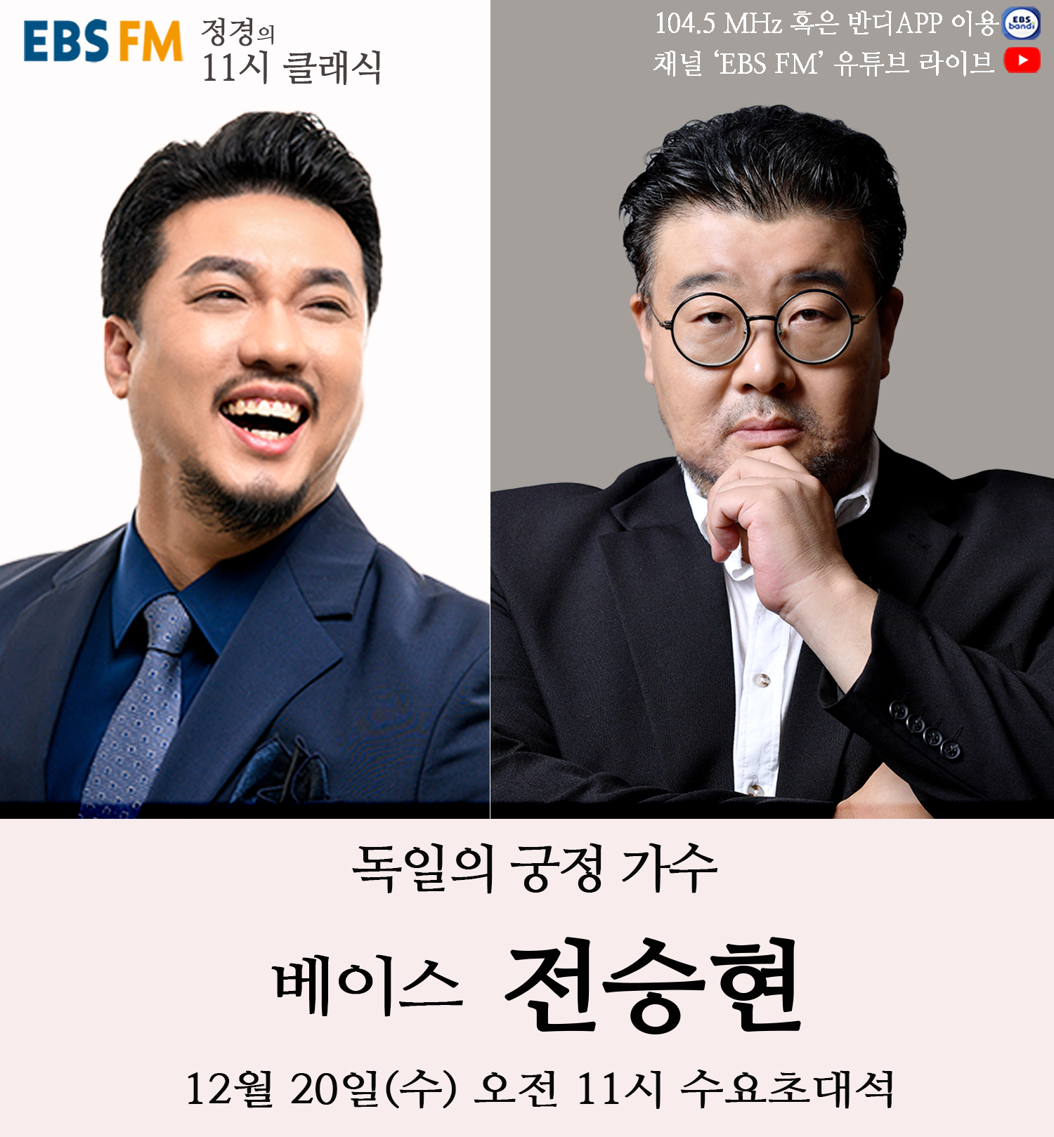 수요일에 방송되고 있는 '수요초대석'에서는 클래식 음악계의 명사들을 초대, 음악과 인생 이야기와 함께 진지하면서도 솔직담백한 토크를 이어가는 시간이다. 12월 20일에는 독일 정부가 수여하는 예술가들의 최고 영예인 캄머쟁어(궁정가수) 작위를 받은 베이스 전승현이 출연, 음악과 함께 해온 뜨거운 인생 이야기를 들려준다.