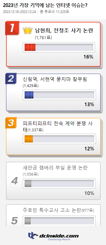 커뮤니티 포털사이트 디시인사이드(대표 김유식)가 `2023년 가장 기억에 남는 인터넷 이슈는?`으로 투표를 한 결과 '남현희, 전청조 사기 논란'이 1위에 올랐다. 이 투표는 지난 18일부터 24일까지 총 7일간 진행했다.