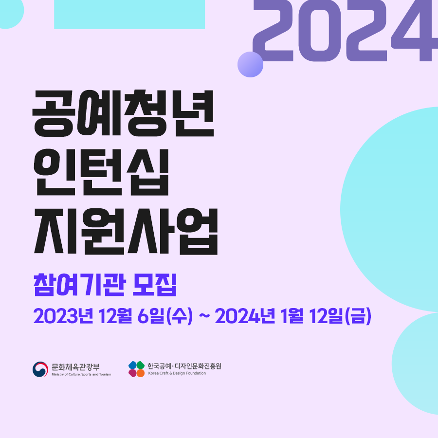 [플레이뉴스 문성식기자] 문화체육관광부(장관 유인촌, 이하 문체부)와 한국공예‧디자인문화진흥원(원장 장동광, 이하 공진원)은 2024년 《공예청년 인턴십 지원》 사업 참여기관을 모집한다.
