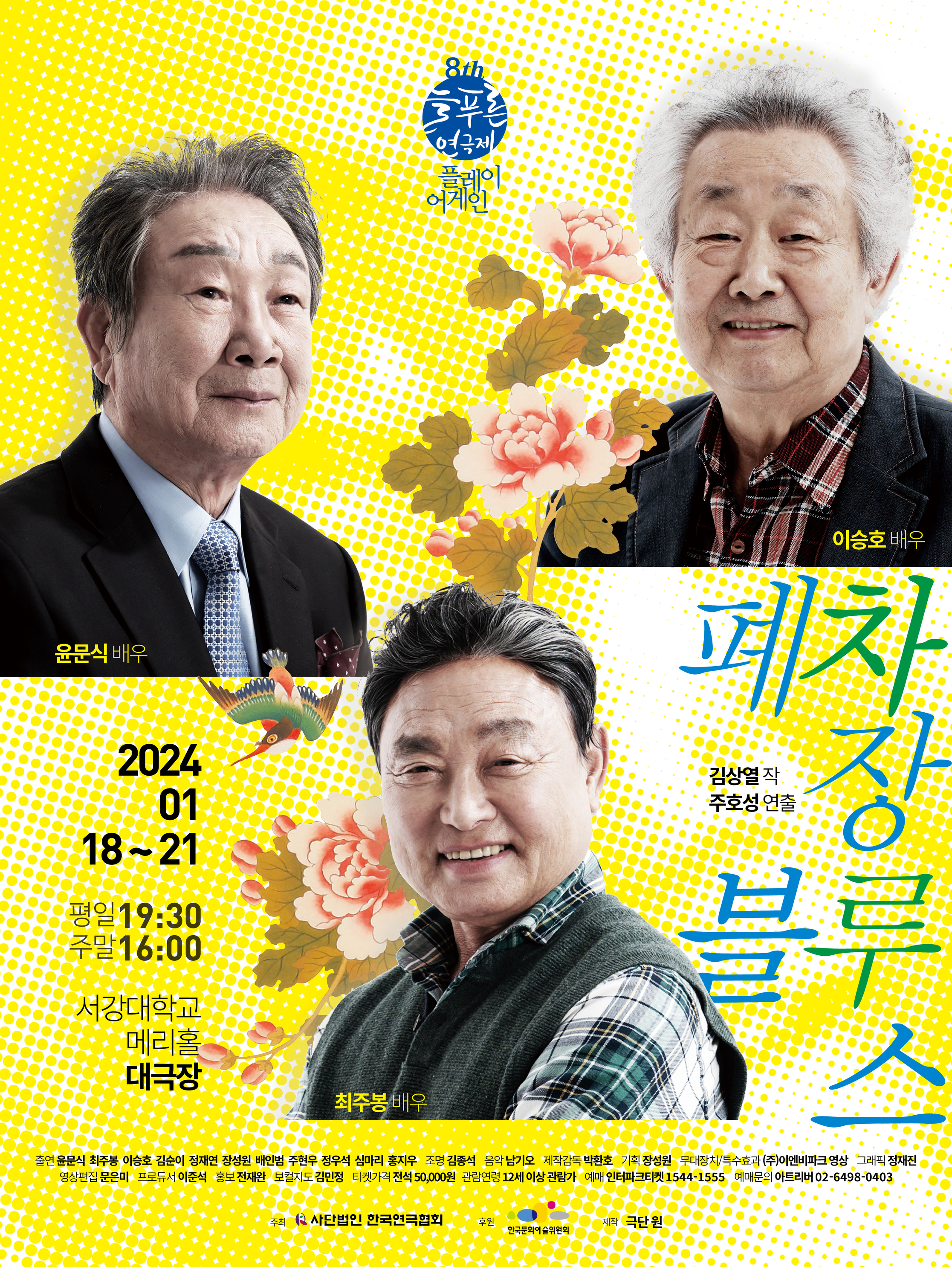 [플레이뉴스 문성식기자] 원로 연극인을 조명하는 올해 8회째 ‘늘푸른연극제’ 참가작 연극 '폐차장블루스'(김상열 작·주호성 연출)가 오는 18일부터 21일까지 서울 마포구 서강대 메리홀 대극장에서 공연한다