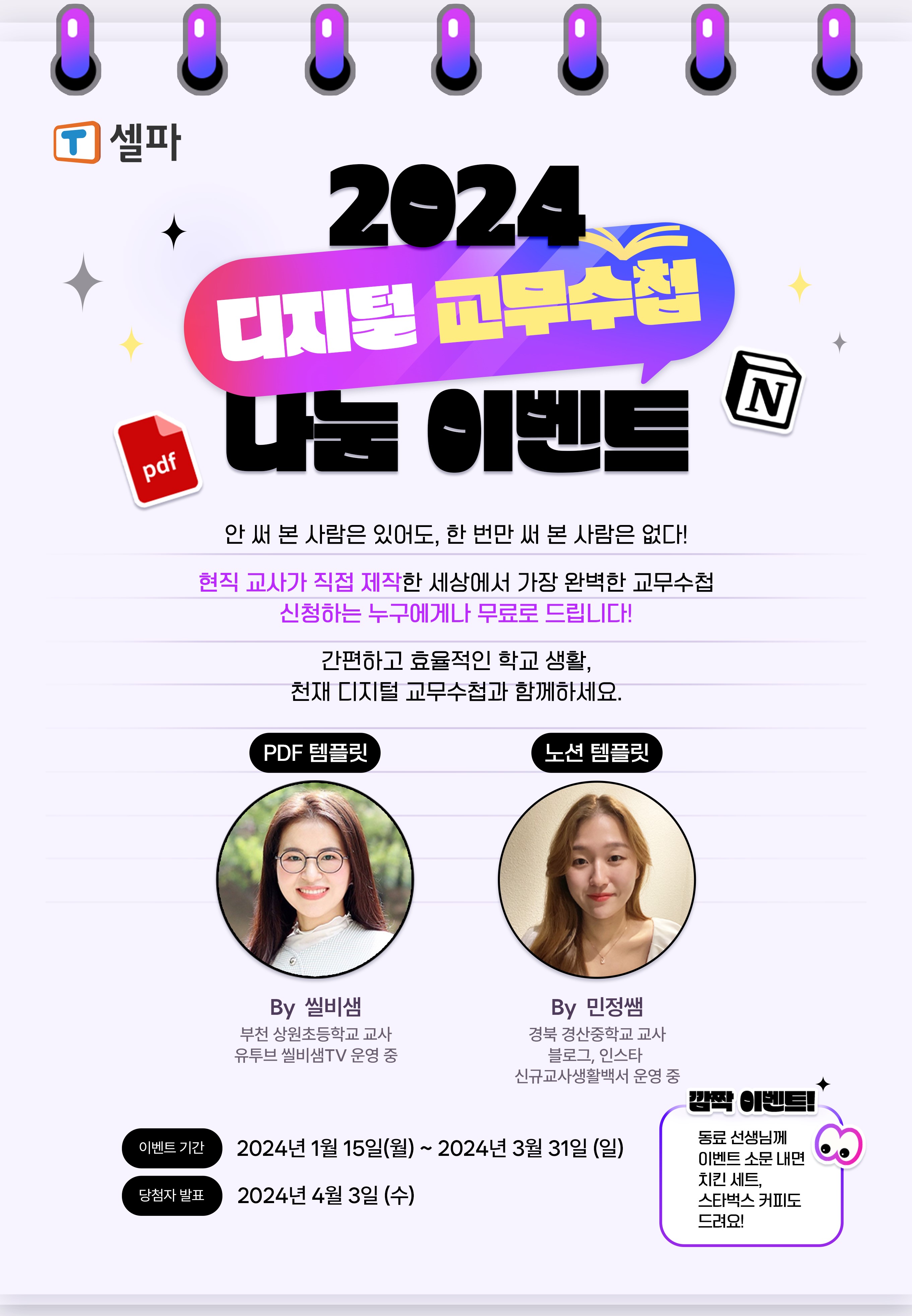 천재교육·천재교과서, ‘2024 디지털 교무수첩 나눔 이벤트’ 실시!- PDF·노션 두 가지 버전의 템플릿 무료로 제공…업무 효율성 향상 기대- 현직 교사 제작 참여로 현장 활용성 높여