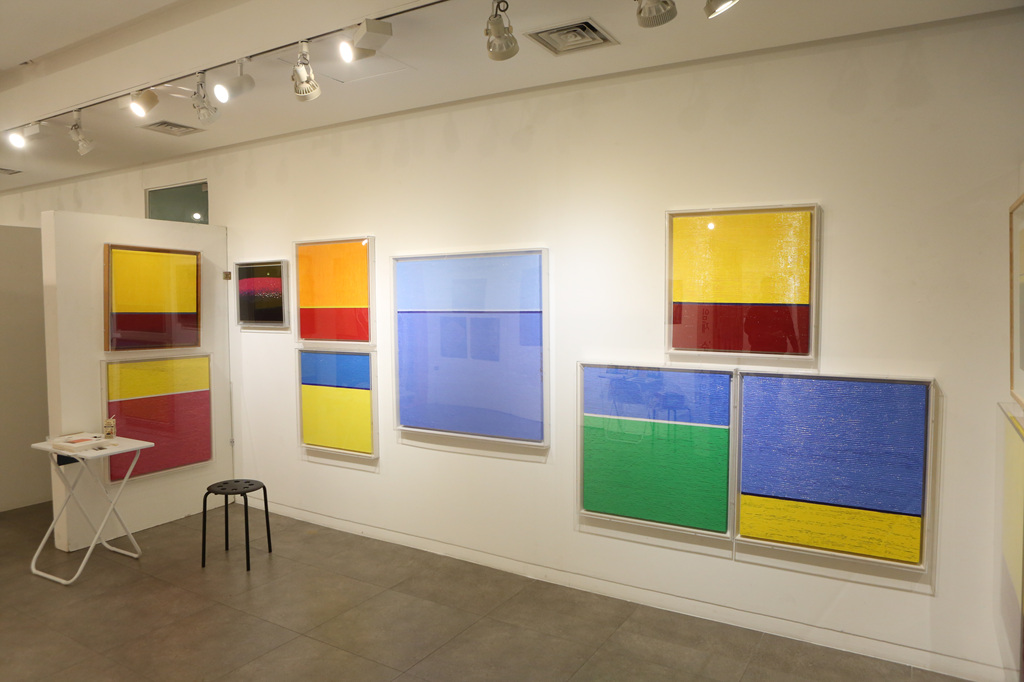 유승조 작가는 빨강, 노랑, 파랑의 3원색을 화면에 도입해서 수평선에 의한 평화로운 평형의 미학과 수직선에 의한 내림의 미학으로 평화의 이미지를 만들었다.