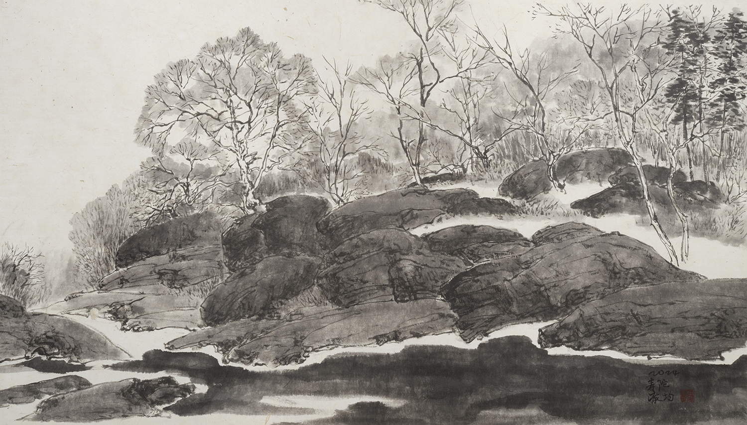 작가는 흑백의 수묵으로 표현하는 산수화를 통해 자연의 아름다움과 인간의 삶의 의미를 담아내고자 한다. 그는 산의 형상을 과감하게 생략하고, 먹과 물의 농도를 조절하며 빠르고 강한 필선의 산의 느낌을 연출한다.
