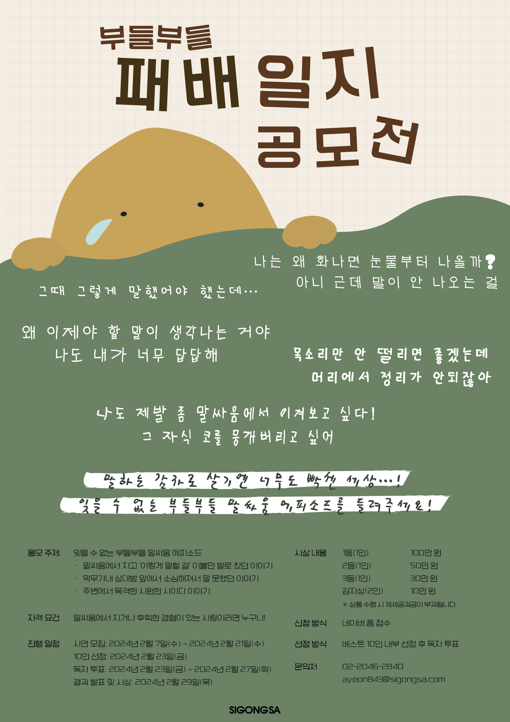 시공사는 책 출간과 함께 책의 주제인 ‘논쟁’에 맞춰 부들부들 패배일지 에피소드 공모전을 진행한다.
