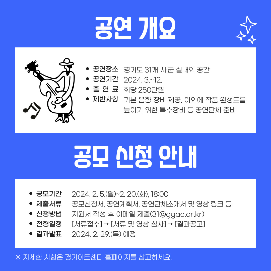 • 제출서류 : 공모신청서, 공연계획서(단체 공연영상링크 포함), 공연단체소개서, 개인정보 수집·이용 동의서, 단체 프로필사진