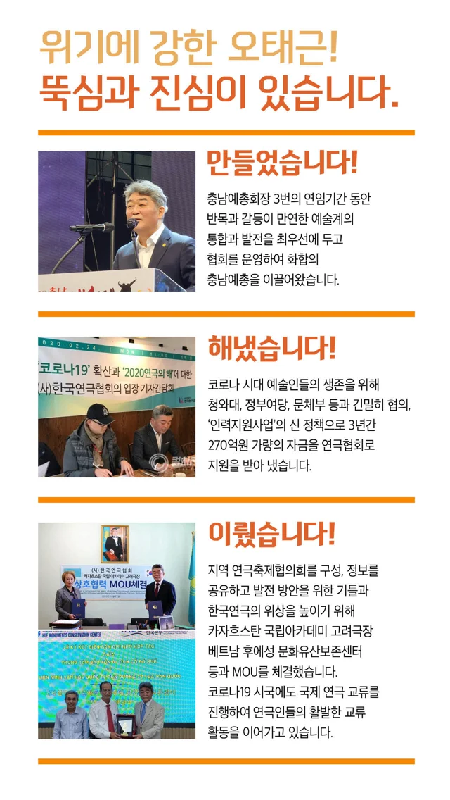 지난 18일에는 한국연극협회 대의원들과 주요임원들이 서울 대학로에 모여 “한국예총 100년의 미래를 책임질 적임자”라며 오태근 회장 지지선언을 했다.