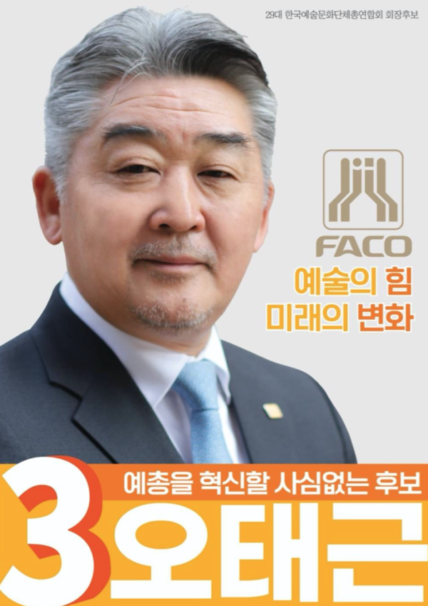 이번 선거에는 오태근 회장 외에 미술·음악분야에서 각 1명씩 출마해 총 3명이 맞붙는다. 선거는 전국 각 지역별 예총회장 등이 포함된 400여명의 대의원 투표로 치러진다.