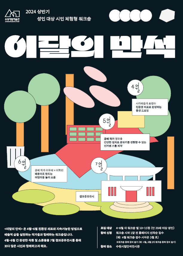 - 작가-시민-전시관이 함께 완성하는 과정 중심 워크숍으로 수원시립만석전시관에서 성인(20세 이상)을 대상으로 무료로 운영