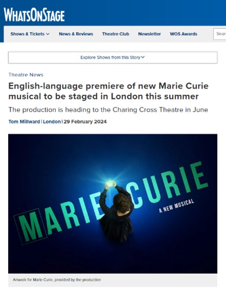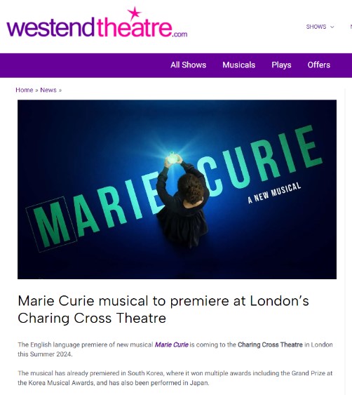■ 창작 뮤지컬 '마리 퀴리' 웨스트엔드 ‘채링 크로스 씨어터(Charing Cross Theatre)’, 6월1일 정식 개막
