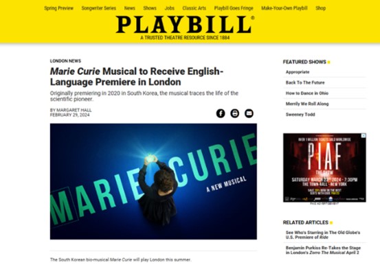 한국 제작사가 직접 제작하는 창작 뮤지컬이 웨스트엔드에서 영국 스태프와 현지 배우들이 참여해 영어로 장기 공연을 올리는 것은 이번이 최초. 미국 대표 공연 전문지 플레이빌(Playbill)도 뮤지컬 '마리 퀴리'의 런던 공연 소식을 다루며 한국 뮤지컬의 웨스트엔드 진출에 주목했다.