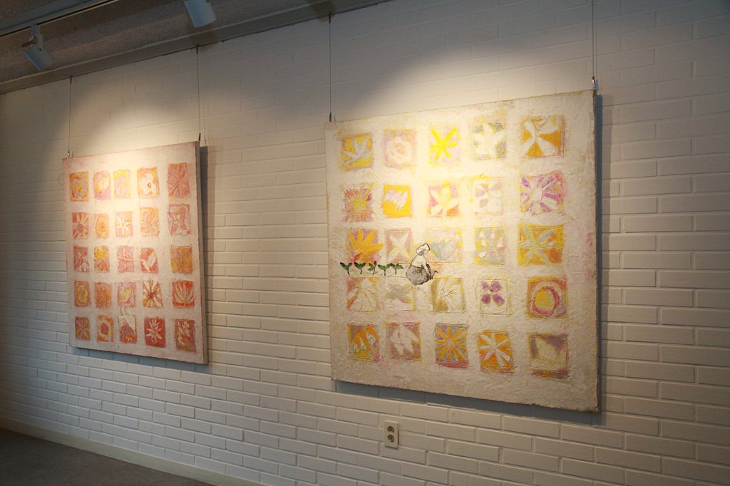 "봄" 작품은 캔버스에 도포된 종이죽의 질감을 느끼며 다양한 꽃문양을 감상할 수 있다. 벽에 붙인 타일 효과처럼 여러 개의 조각에 활짝 핀 봄꽃들은 향기를 내고 있는 듯 정겹다. 분홍빛과 노란빛을 적절하게 배합하여 그린 꽃들은 화사한 봄을 더욱 싱그럽게 만든다.