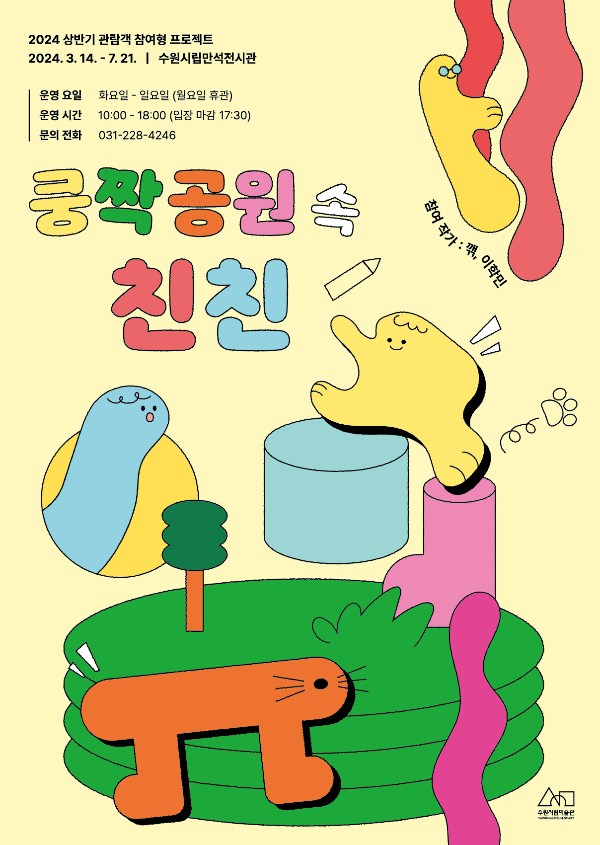 [플레이뉴스 문성식기자] 경기도 수원시립미술관(관장 홍건표)은 현대사회 속 반려의 다양한 모습을 탐구하는 관람객 참여형 프로젝트 《쿵짝공원 속 친친》을 3월 14일(목)부터 7월 21일(일)까지 수원시립만석전시관에서 개최한다.