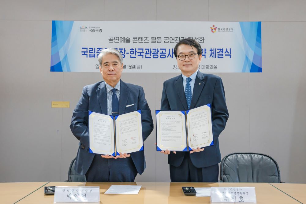 [플레이뉴스 문성식기자] 국립중앙극장(극장장 박인건, 이하 국립극장)과 한국관광공사(이하 관광공사)는 3월 15일(금) 국립극장 대회의실에서 공연예술 콘텐츠 기반의 관광 활성화를 위한 업무협약을 체결했다고 밝혔다.