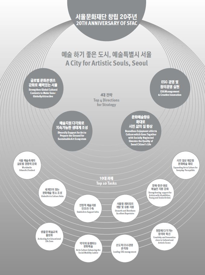 한층 강화된 문화 콘텐츠로 글로벌 매력도시 서울을 만드는 한편, 예술인에게는 지속가능한 예술 생태계를, 시민에게는 문화향유 확대로 삶의 질을 높이고, 본격적인 ESG경영을 실현하여 향후 10년을 이끌어갈 동력을 마련한다는 계획이다.