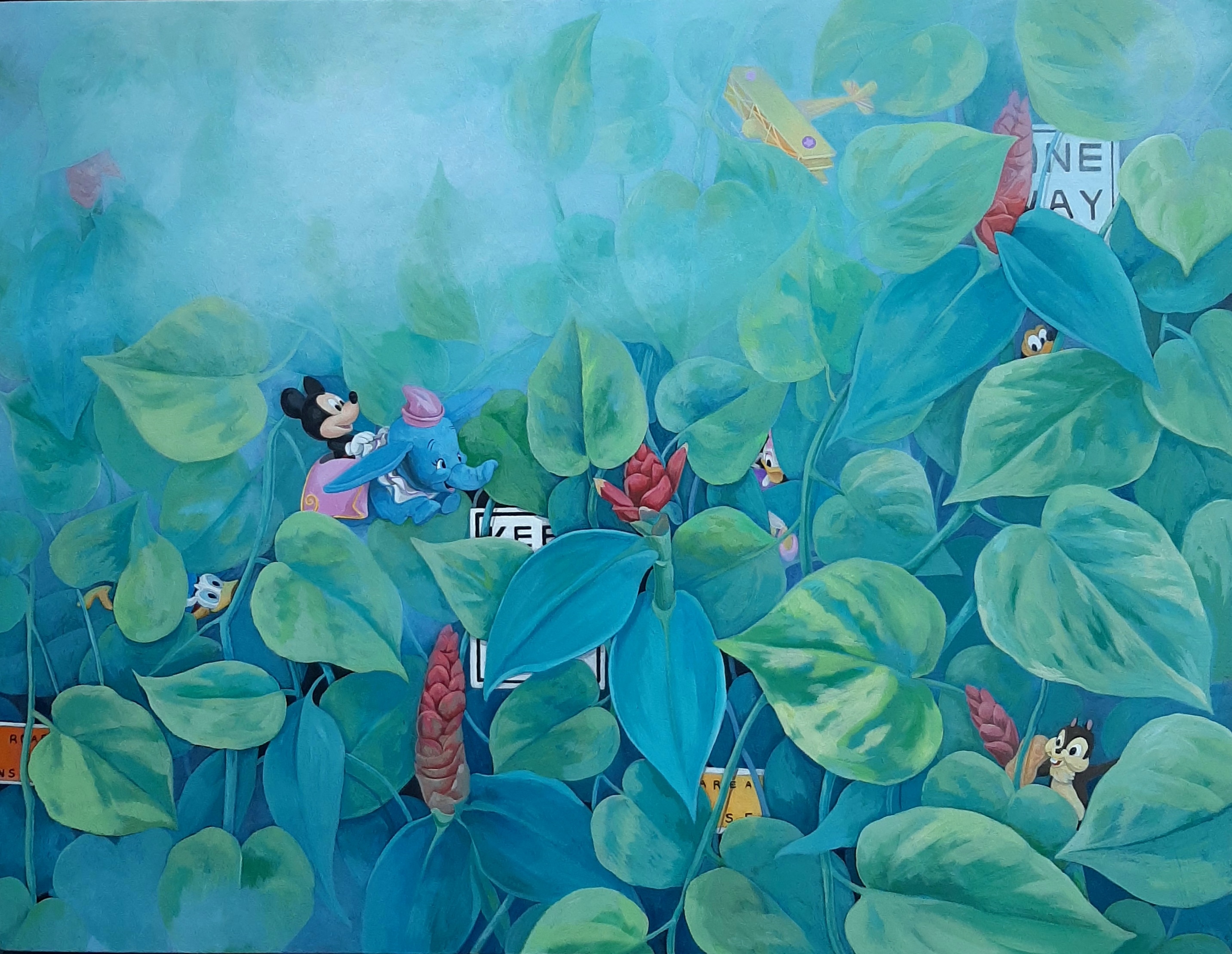 이현진 작가는 새로운 곳에서 얻어오는 이미지들을 조합하여 나만의 공간으로 재구성한다. 익숙한 숲과 가상의 요소를 의도적으로 넣어 작품이 현실이 아닌 상상 속 존재임을 일깨운다. 또 다른 환경을 조성하여 현실에서 보여 지지 않는 내면의 변화를 시각화하여 가시화함으로써 우리 삶의 단편을 위트 있게 드러내려한다.