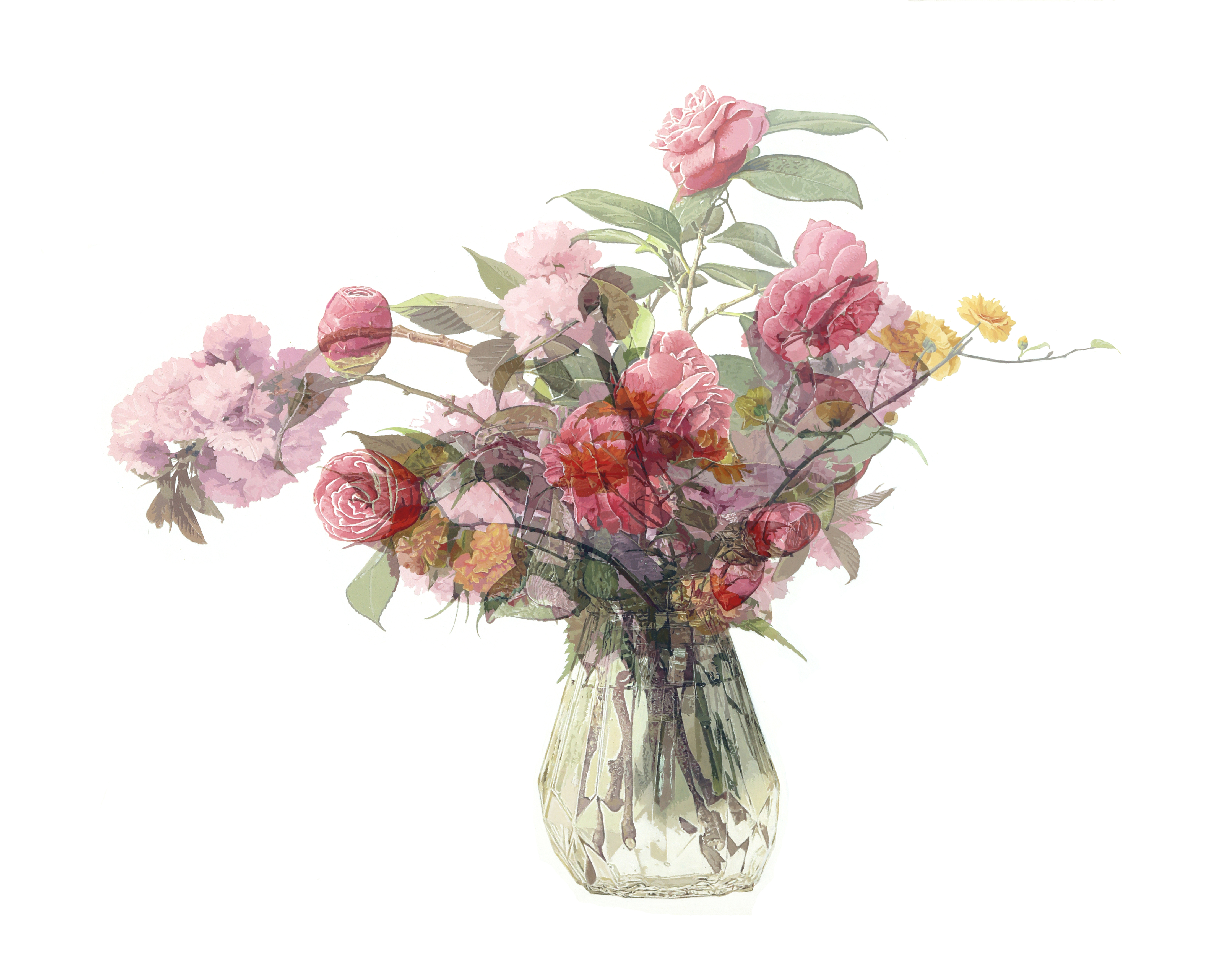 김정우 작가는 한국화의 전통을 현대적으로 재해석한다. 작가는 화병에 담긴 사계절의 꽃을 주제로 꽃의 이미지들을 중첩시켜 잔상으로 표현했다. 한 화면 안에 담긴 자연의 변화처럼 인간의 감정을 작품에 녹이고 그 존재에 대해 사유한다.