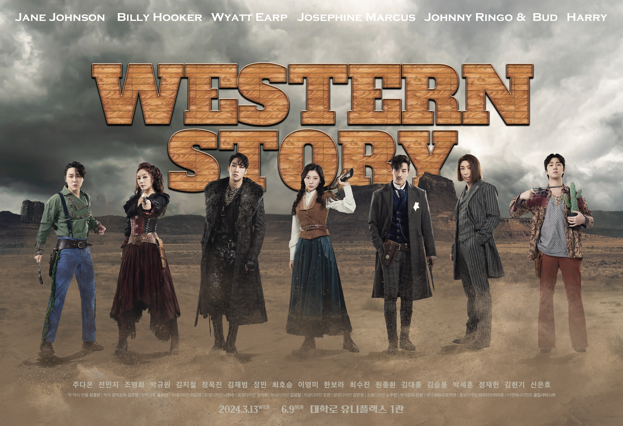 주요 배경이 되는 다이아몬드 살롱의 주인 ‘제인 존슨’ 역에 주다온, 전민지, 조영화, 서부 최고의 악당이 되고 싶은 총잡이 ‘빌리 후커’ 역에 박규원, 김지철, 정욱진, 서부의 전설적인 영웅 ‘와이어트 어프’ 역에 김재범, 정민, 최호승, OK 목장 결투의 히로인 ‘조세핀 마커스’ 역에 이영미, 한보라, 최수진, 서부의 저승사자로 불리는 악당 ‘조니 링고’ 역에 원종환, 김대종, 김승용, 제인의 친구이자 다이아몬드 살롱의 감초인 쌍둥이 ‘버드’ 역에 박세훈, 정재헌, ‘해리’ 역에 김현기, 신은호가 출연한다