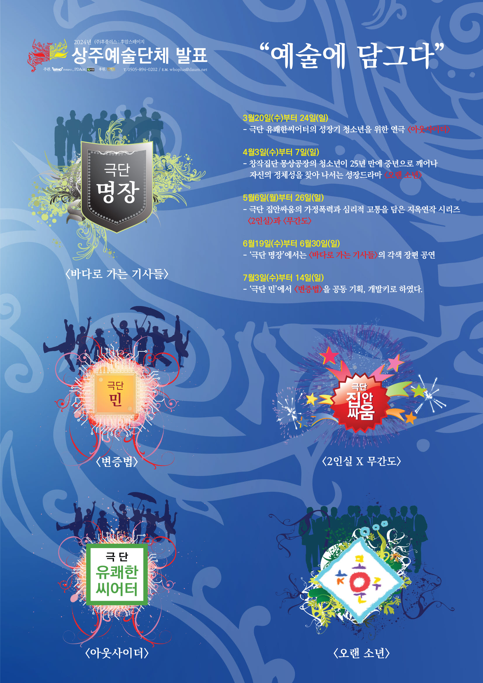 이번 선정된 상주단체로 극단 민(대표 정영민), 창작집단 몽상공장(대표 변영후), 유쾌한씨어터(대표 염창선) 극단 집안싸움(대표 이준석) 그리고 지난 23년도의 우수단체로서 2개년 지원에 선정된 극단 명장 (대표 윤현식)이 선정되었다.