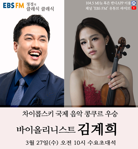 3월 27일 수요일 '수요초대석'에서는 세계적인 권위를 지닌 차이콥스키 국제 음악 콩쿠르 기악 부문에서 한국인 최초로 우승한 바이올리니스트 김계희가 출연해 멋진 라이브 연주와 함께 열정 가득한 음악과 인생 이야기를 들려준다.