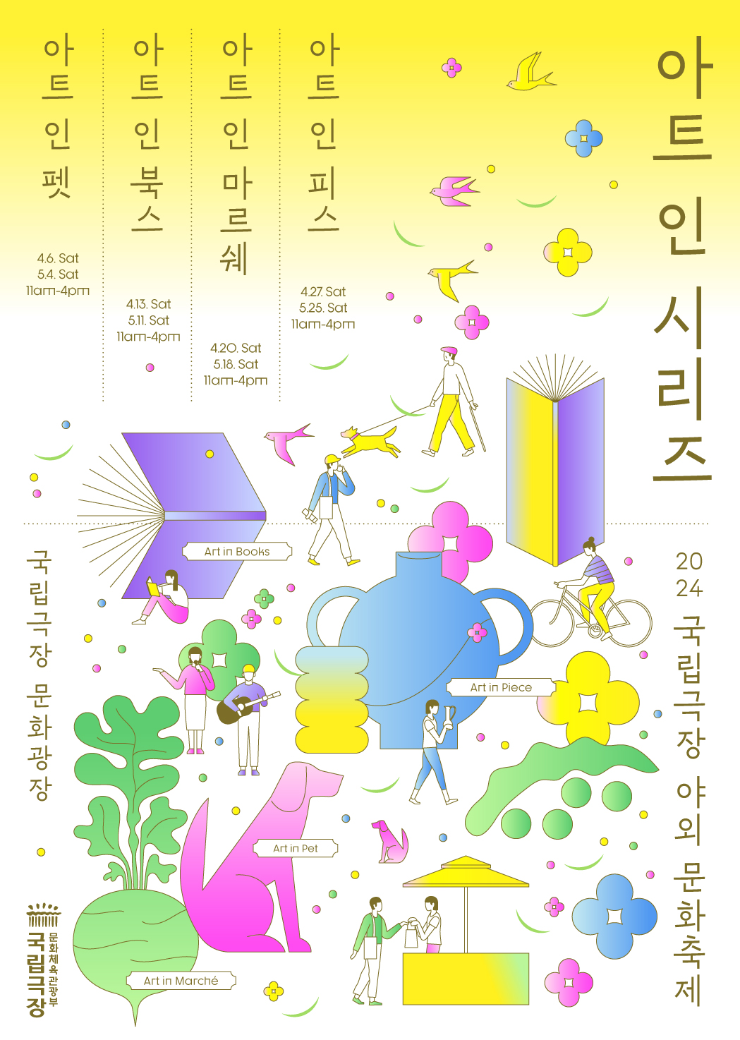 반려견 축제, 도서 시장, 농부 시장, 문화 시장 등 매주 다른 주제로 진행되며, 공연·워크숍·체험 행사 등 다양한 이벤트까지 함께 어우러진다. ‘아트 인 시리즈’는 오전 11시부터 오후 4시까지 진행되며, 별도 신청 없이 당일 현장에서 자유롭게 참여할 수 있다.