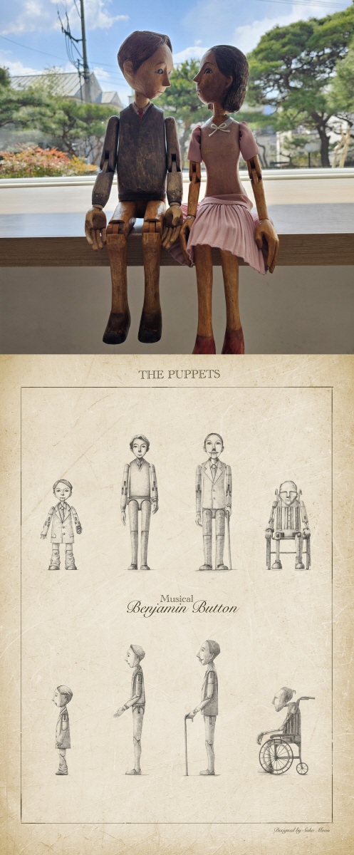 문수호 작가에 따르면 이번 뮤지컬 ‘벤자민 버튼’에서는 ‘마네킨’과 ‘로드퍼펫’이라는 양식의 퍼펫이 구현된다. 이 중 ‘마네킨 퍼핏’은 두 가지 사이즈로 구분해 제작되며, 시간의 흐름에 따라 변화하는 벤자민을 표현한 퍼펫은 실제 사람 사이즈로 유년, 청년, 중년, 노년으로 디자인된다.