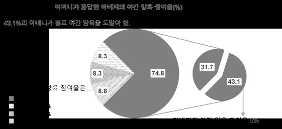 연구팀이 6~36개월의 영·유아를 자녀로 둔 국내 여성 290명을 대상으로 ‘배우자의 야간 양육 참여율’을 조사한 결과, 응답자의 43.1%가 ‘배우자의 도움 없이 독박 야간 양육을 하고 있다(0%)’고 답했다.