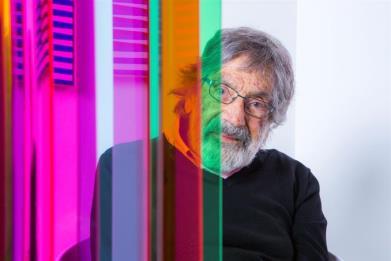 Carlos Cruz-Diez behind a Transchromie in his artist's studio, 2017