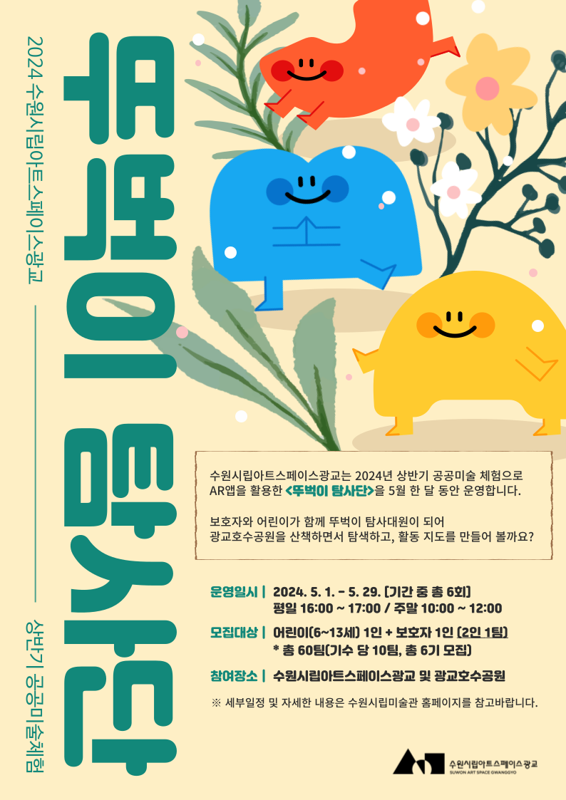 '뚜벅이 탐사단'은 수원의 대표적인 문화공간인 수원시립아트스페이스광교와 인근 광교호수공원 일대에서 미술관 자체 개발 AR 앱 콘텐츠 '디지털워킹! 아트숲'을 활용한 자연물 탐색과 미술 놀이를 함께 경험할 수 있는 교육 프로그램이다.